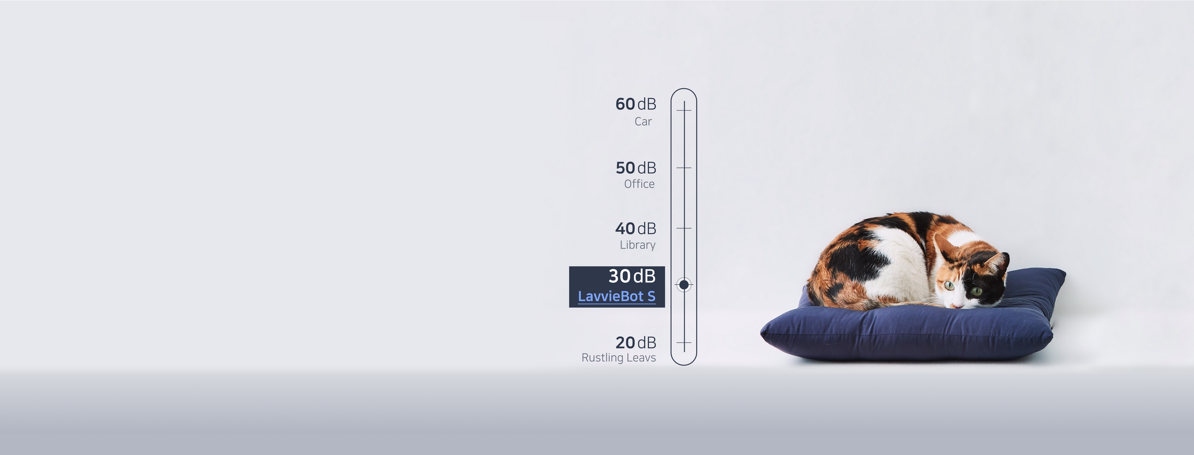 The noise level of operation mode is about 30dB, which is equivalent to the sound of a clock, a cricket, or a quiet library. Cats are very sensitive to sounds, thus minimizing the operating sound of LavvieBot S was a priority.
